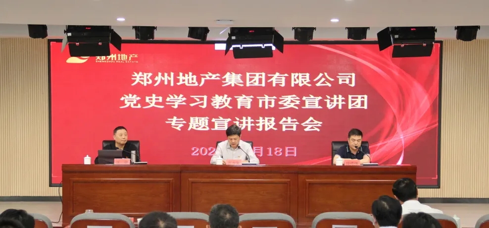為持續(xù)推進黨史學(xué)習(xí)教育走深走實,5月18日上午,鄭州市委宣講團走進鄭州地產(chǎn)集團,在集團301多功能廳開展黨史學(xué)習(xí)教育專題宣講報告會。報告會由鄭州市委宣講團成員、鄭州工程技術(shù)學(xué)院馬克思主義學(xué)院副教授張豪主講,市國資黨史學(xué)習(xí)教育第二巡回指導(dǎo)組組長、四級調(diào)研員段德強,指導(dǎo)組成員張詩雨、陳祥斐到會巡聽旁聽,地產(chǎn)集團領(lǐng)導(dǎo)班子、總部全體員工,各子公司支部書記、黨建部門負責(zé)人等共計150余人參加現(xiàn)場報告會,各子公司員工共計170余人通過線上直播進行觀看,會議由地產(chǎn)集團黨委書記、董事長萬永生主持。