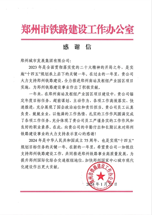 同時,城發(fā)集團(tuán)大力支持鄭州鐵路建設(shè),全力推進(jìn)鄭州南站及樞紐產(chǎn)業(yè)園項目實(shí)施,超前謀劃、主動作為,各項工作高效落實(shí)、快速推進(jìn),充分展現(xiàn)了國企政治站位和責(zé)任擔(dān)當(dāng)。做一件好事,添一份美麗 ,再收到鄭州市鐵路建設(shè)工作辦公室的感謝信!