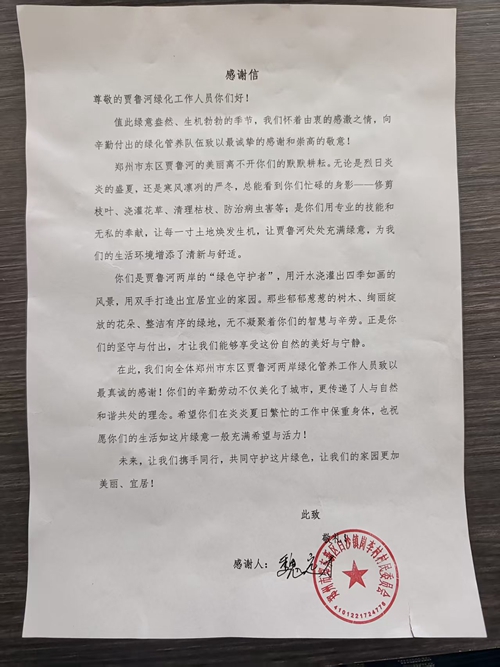 近日,鄭州市賈魯河綠化養(yǎng)護(hù)工作收獲暖心認(rèn)可。鄭東新區(qū)崗李村村委向養(yǎng)護(hù)團(tuán)隊(duì)贈送錦旗和感謝信,以“朝迎晨露修枝葉,暮披霞光護(hù)綠茵” 贊揚(yáng)工作人員的辛勤付出。