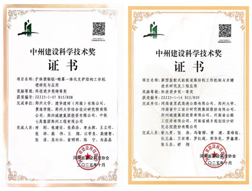 鄭州城建集團的“擴體預制樁—帷幕一體化支護結構工作機理研究與應用”與“新型裝配式樁板道路結構工作機制與關鍵技術研究及工程應用”兩項科研項目,分獲河南省“中州建設科學技術獎”特等獎和一等獎。