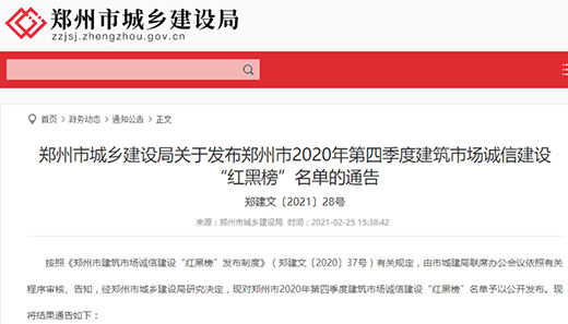 2月25日,鄭州市城鄉(xiāng)建設(shè)局發(fā)布鄭州市2020年第四季度建筑市場誠信建設(shè)“紅黑榜”名單的通告(鄭建文〔2021〕28號),鄭州地產(chǎn)集團(tuán)投資管理有限公司榮登“紅榜”單位,趙玨榮登“紅榜”個(gè)人。
